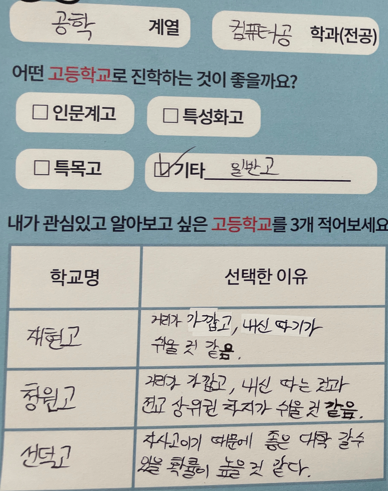 오늘 진지하게 고민하고 적어보았던 이 활동이, 우리 친구들의 고등학교 진학에 도움이 될 수 있을 거에요!