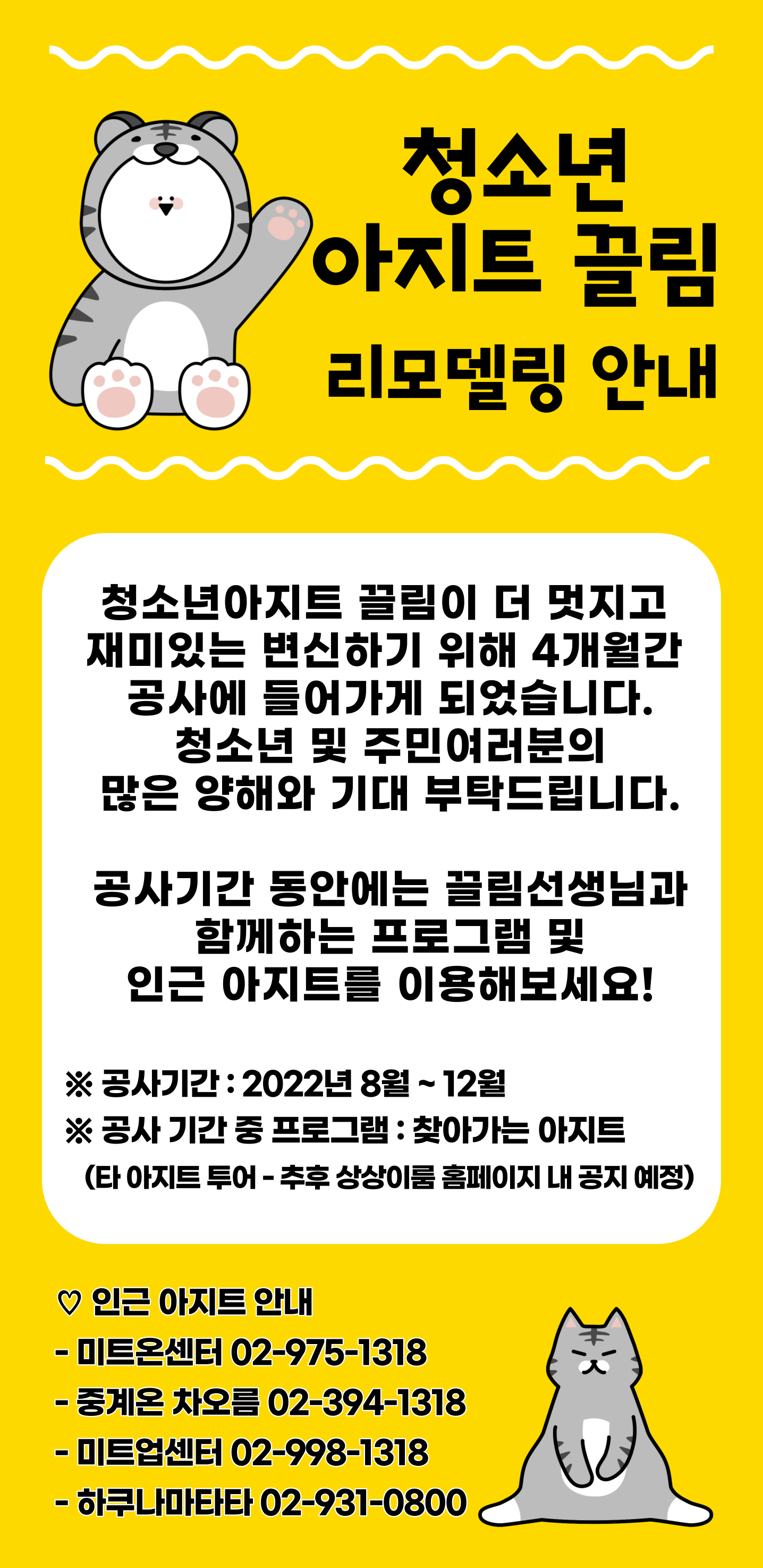 | [공지]상상이룸센터 리모델링 및 이전안내 (0) | 2022.07.19 |