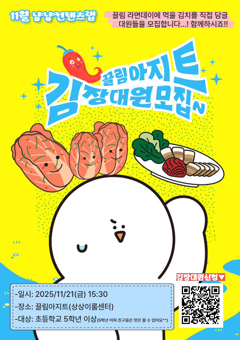 2025년 11월 끌림아지트에서 끌림 시니어선생님과 함께 진행하는 '냠냠컨텐츠랩' 사전신청입니다. ■ 시니어쌤과 함께하는 김장김치 만들기 15:30 선착순 15명 ※신청이 완료되면 문자가 발송되오