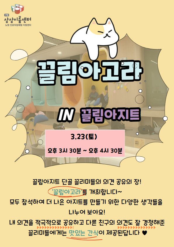 끌림 아고라는 아지트 단골 손님인 우리 끌리미들이 상상이룸센터에 대해 자유롭게 의견을 공유하는 행사입니다.