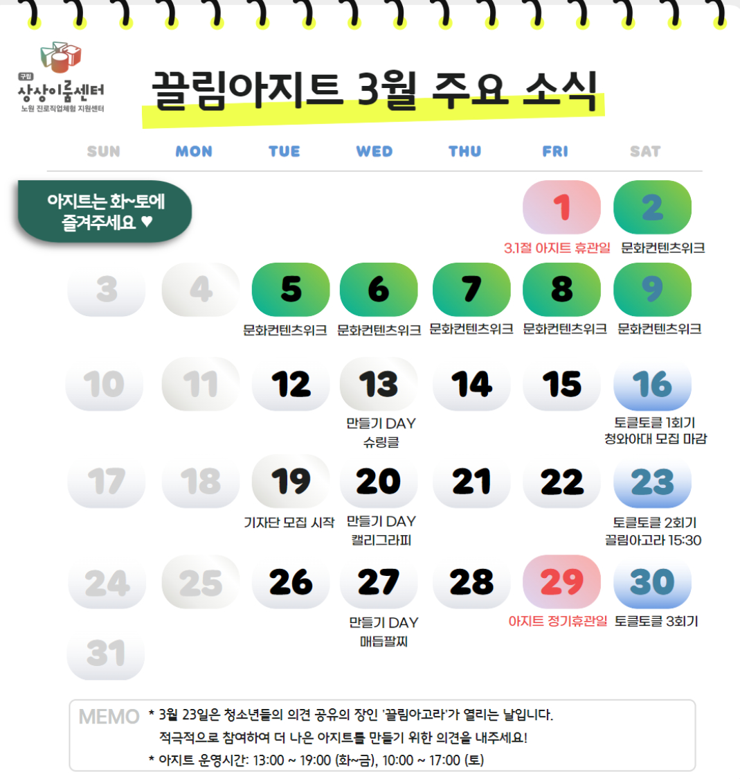3월의 주요 일정에 대해 공유하고자 끌림아지트의 월간달력을 업로드합니다.