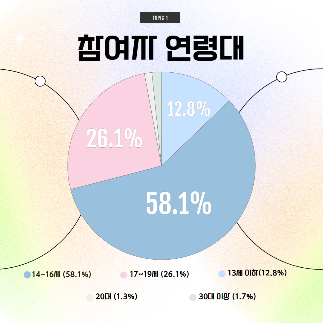 특히, 14~16세 중학생 분들이 응답자의 58.1%로 과반수 이상을 차지하였습니다.