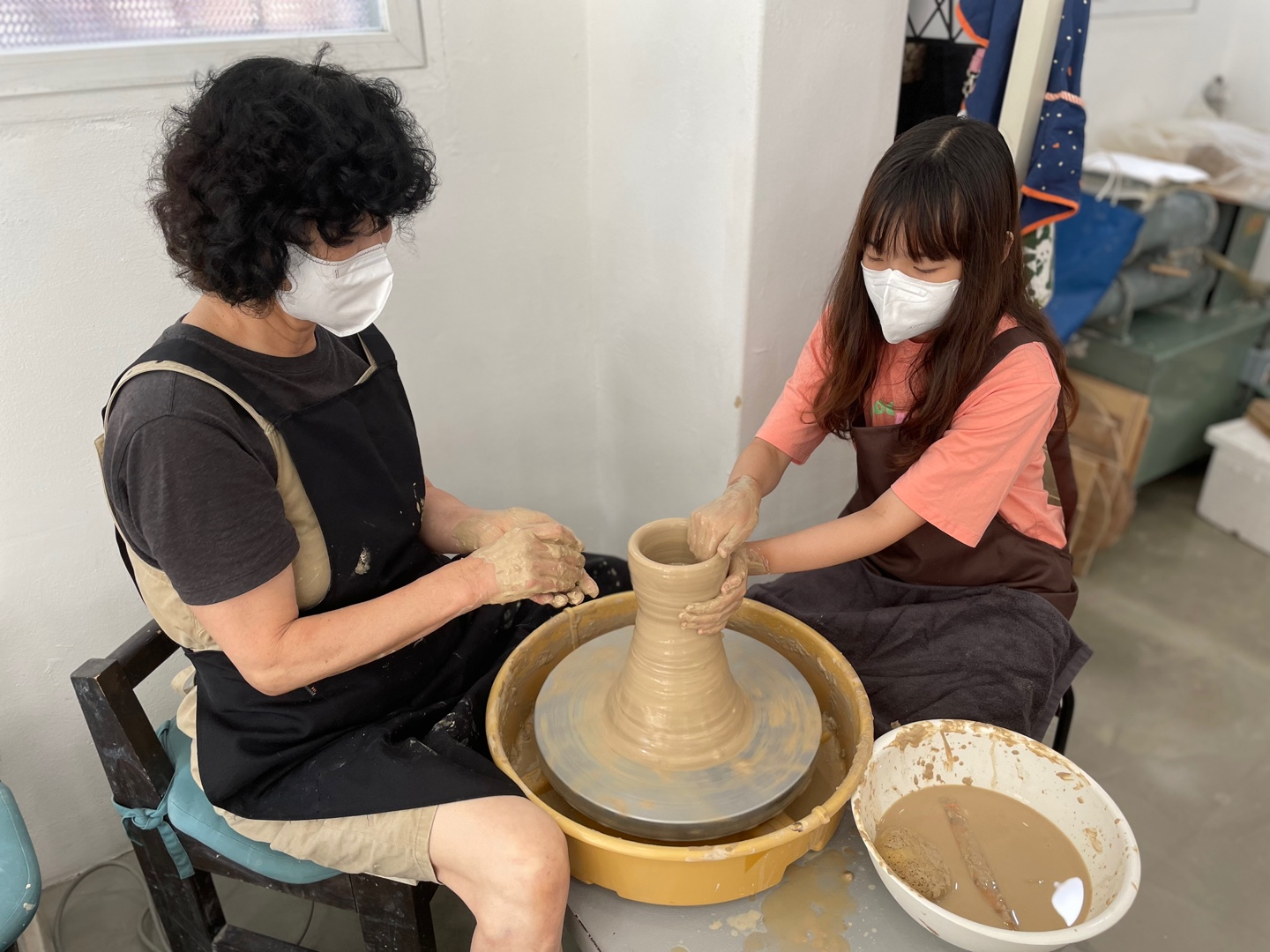 선생님과 2인 1조가 돼서 도자기를 예쁘게 잘 빚어줘요
