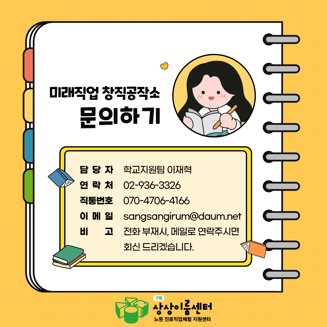 문의 : 상상이룸센터(노원진로직업체험지원센터) 학교지원팀 이재혁 070-4706-4166