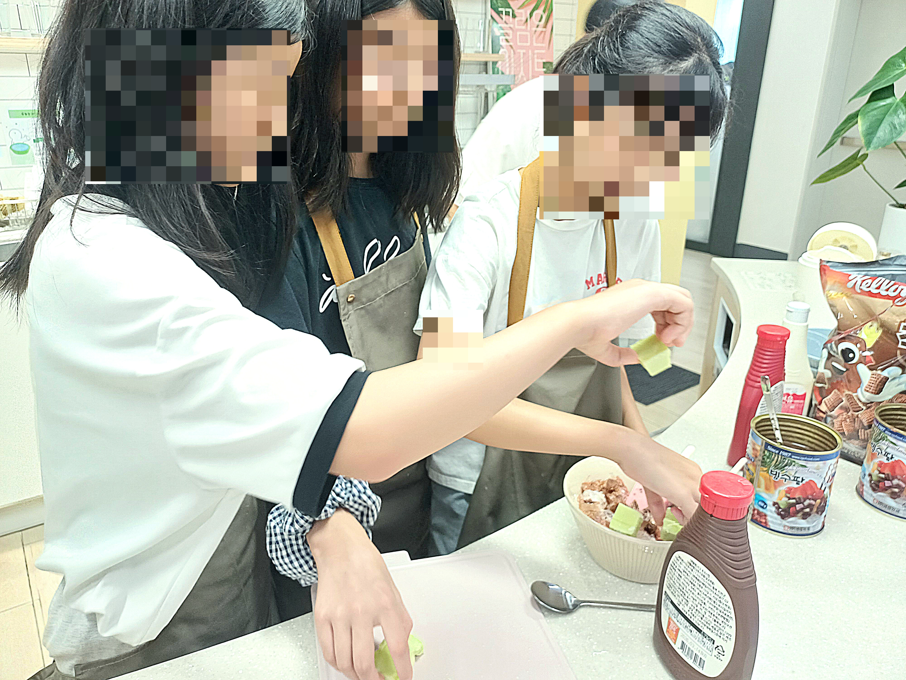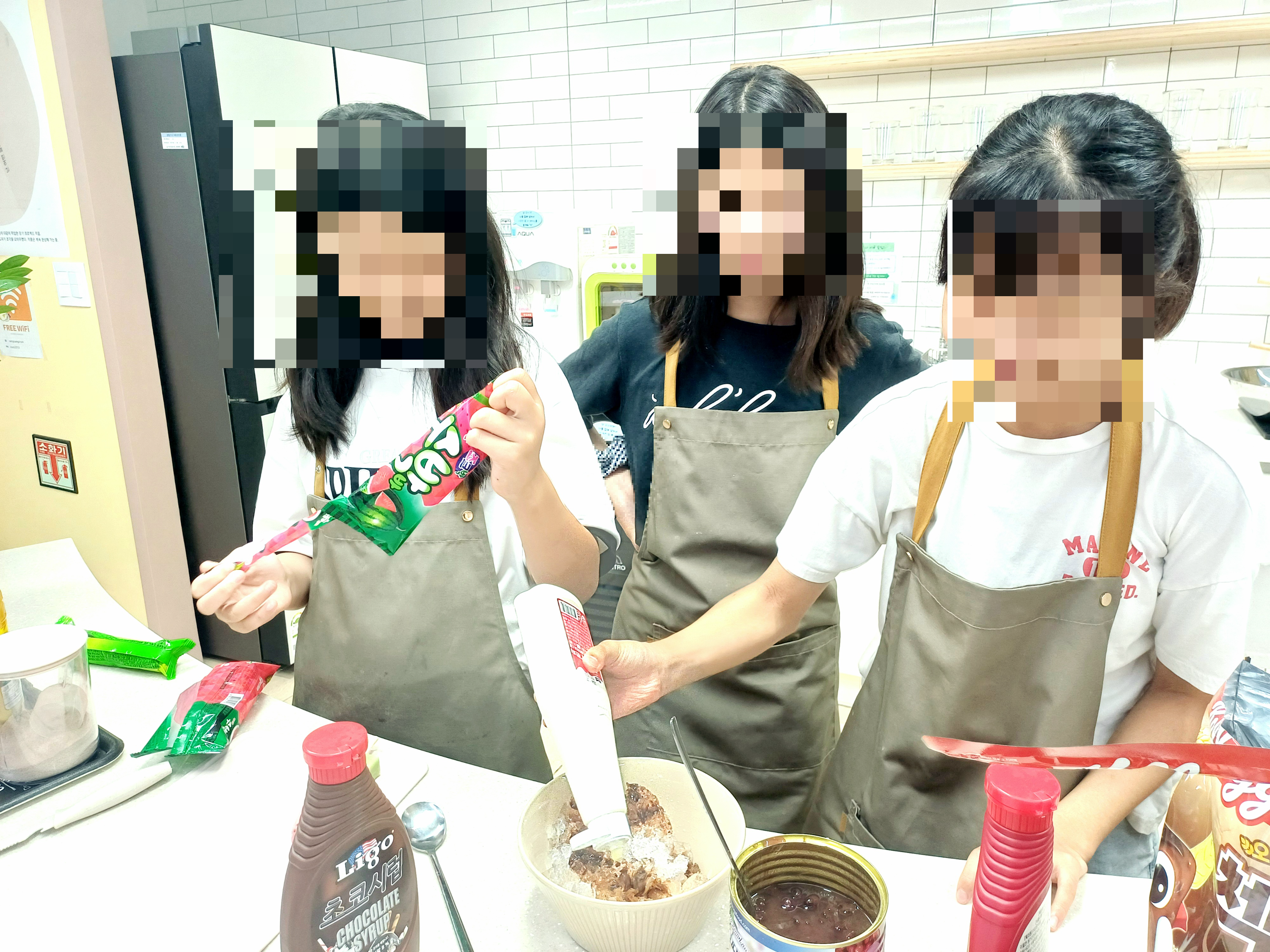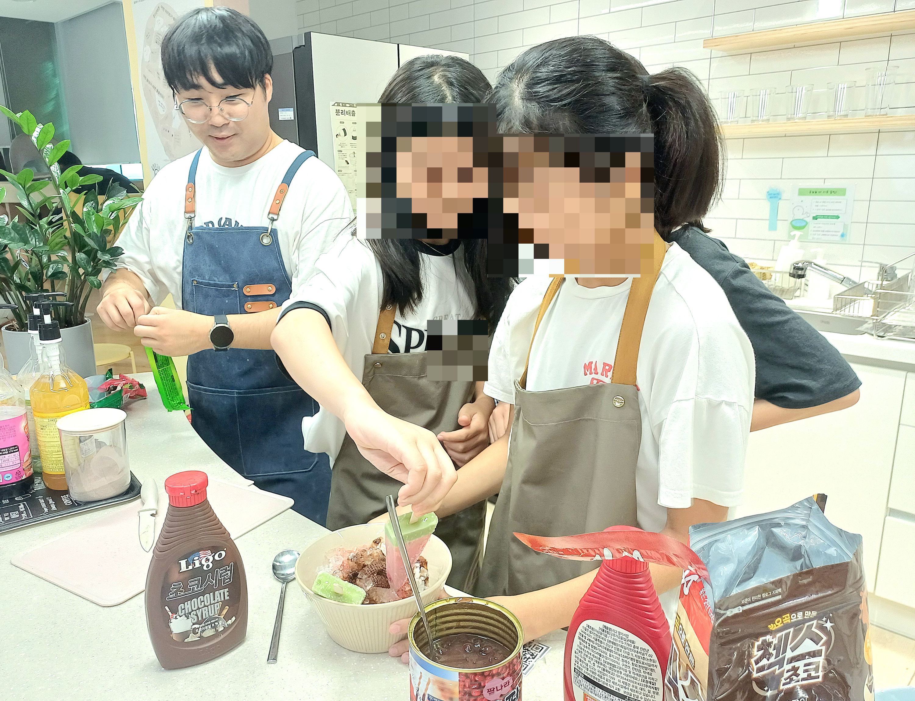 앞치마를 동여맨 아이들이 직접 얼음을 갈고, 토핑도 올려 주는 모습입니다.