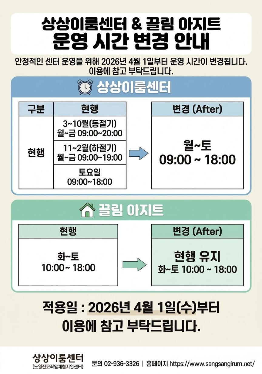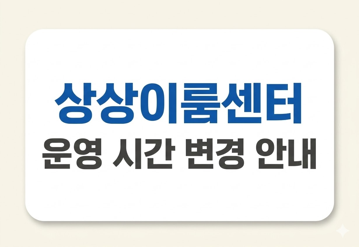 안정적인 센터 운영을 위해 2026년 4월 1일(수)부터 상상이룸센터의 운영 시간이 아래와 같이 변경됩니다.