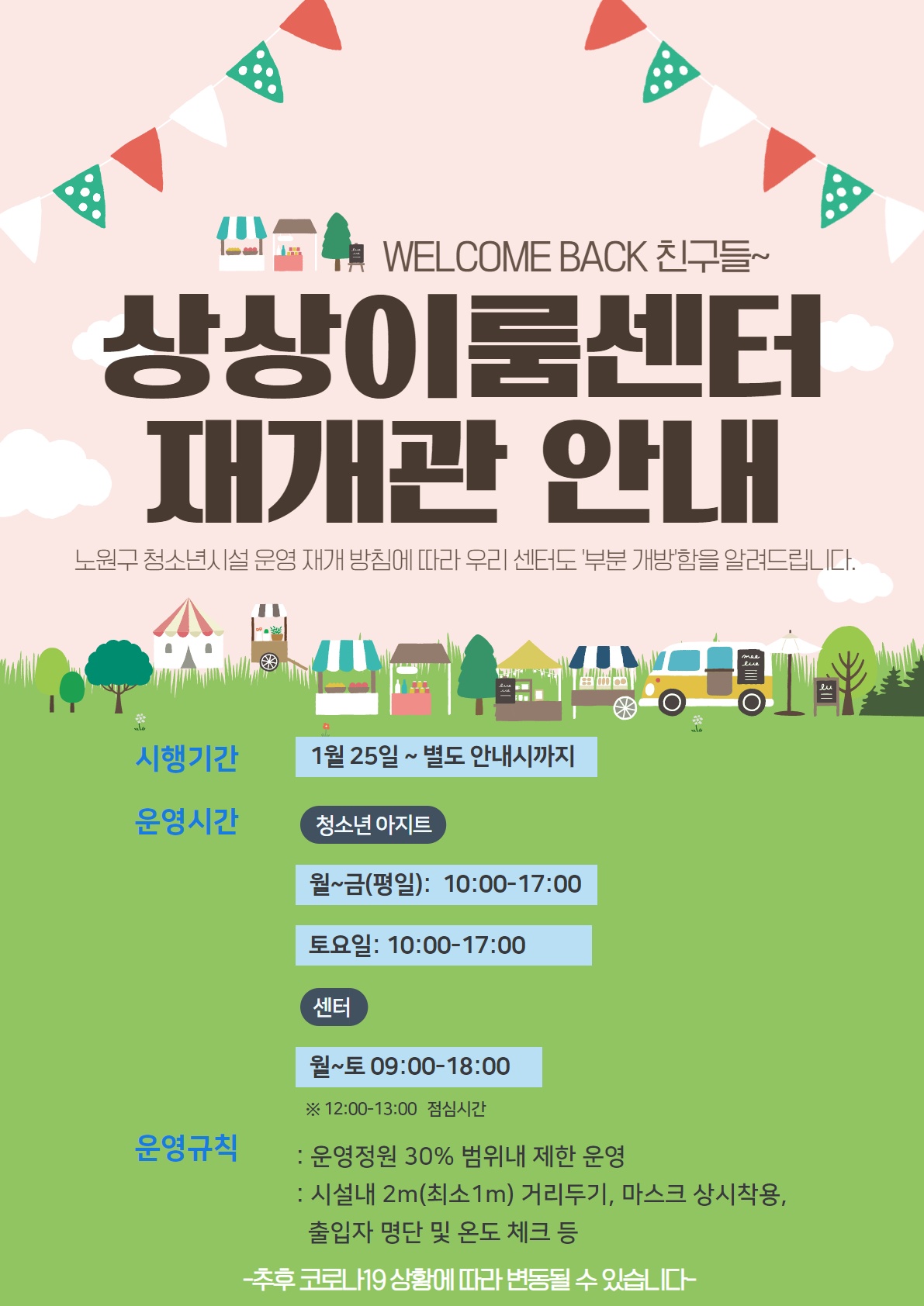 | 상상이룸센터 시설 재개관 일정 연기 안내 (0) | 2021.01.25 |