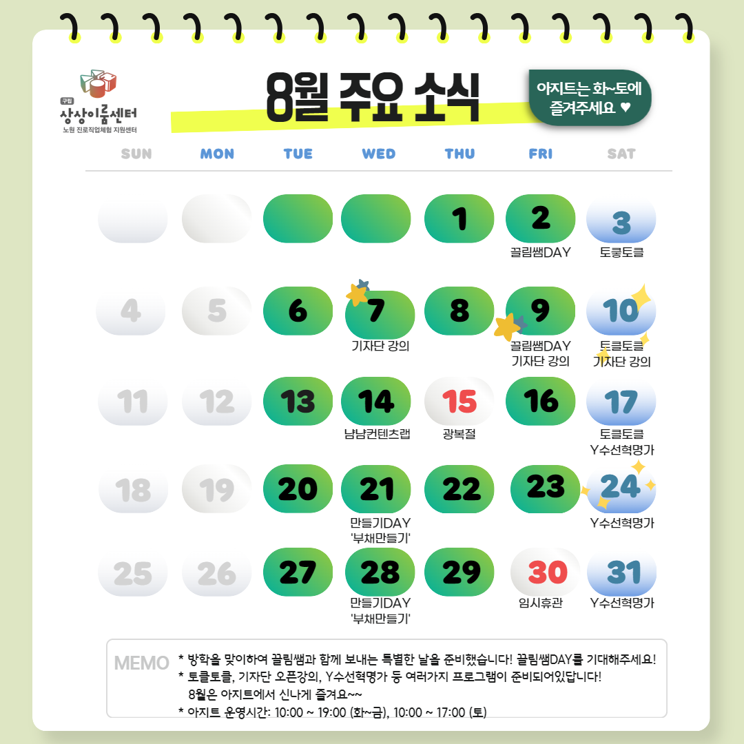 *8월의 아지트 휴관일은 15일(광복절), 30일(임시휴관)입니다.*