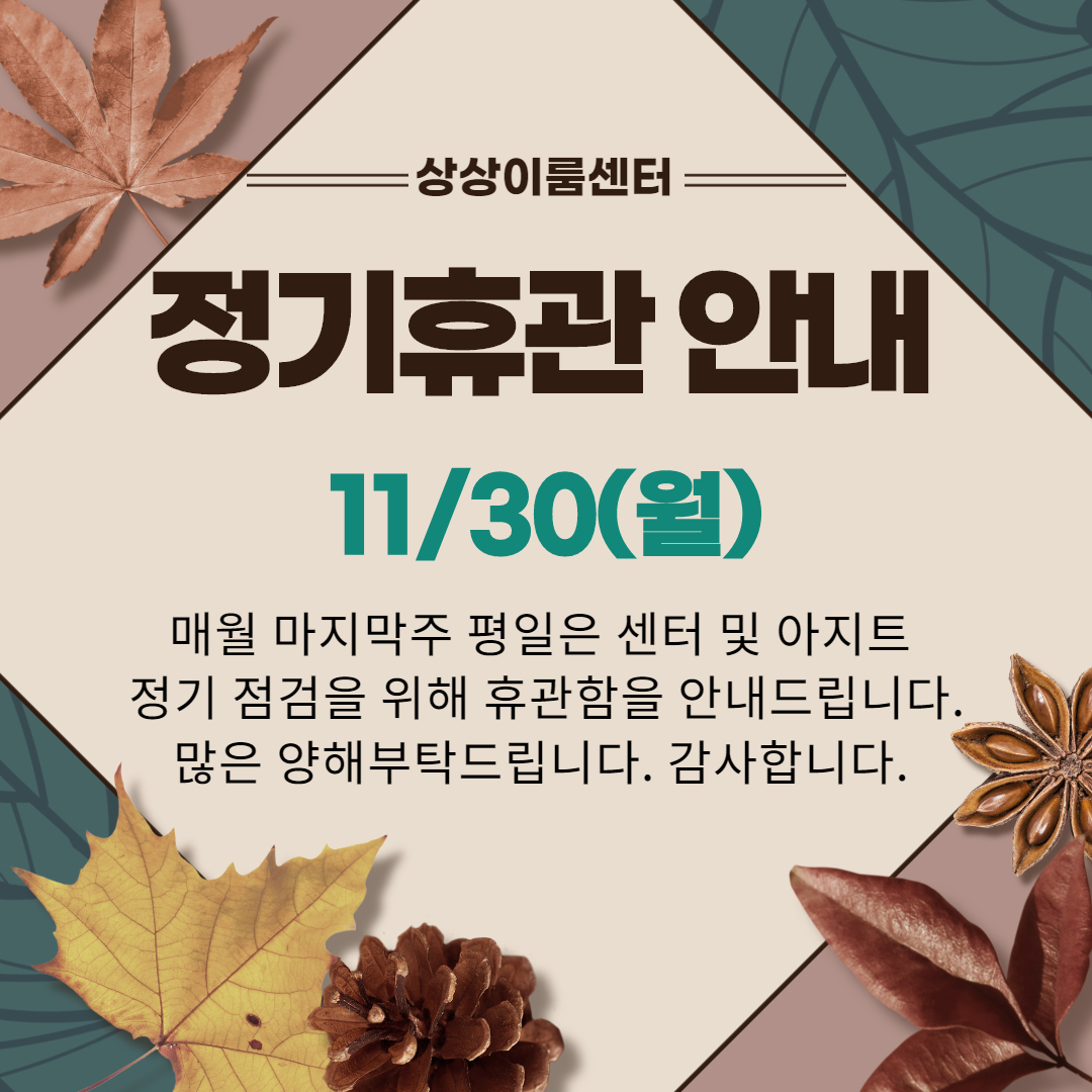 매월 마지막주 평일은 센터 및 아지트 정기점검을 위해 휴관함을 안내 드립니다.