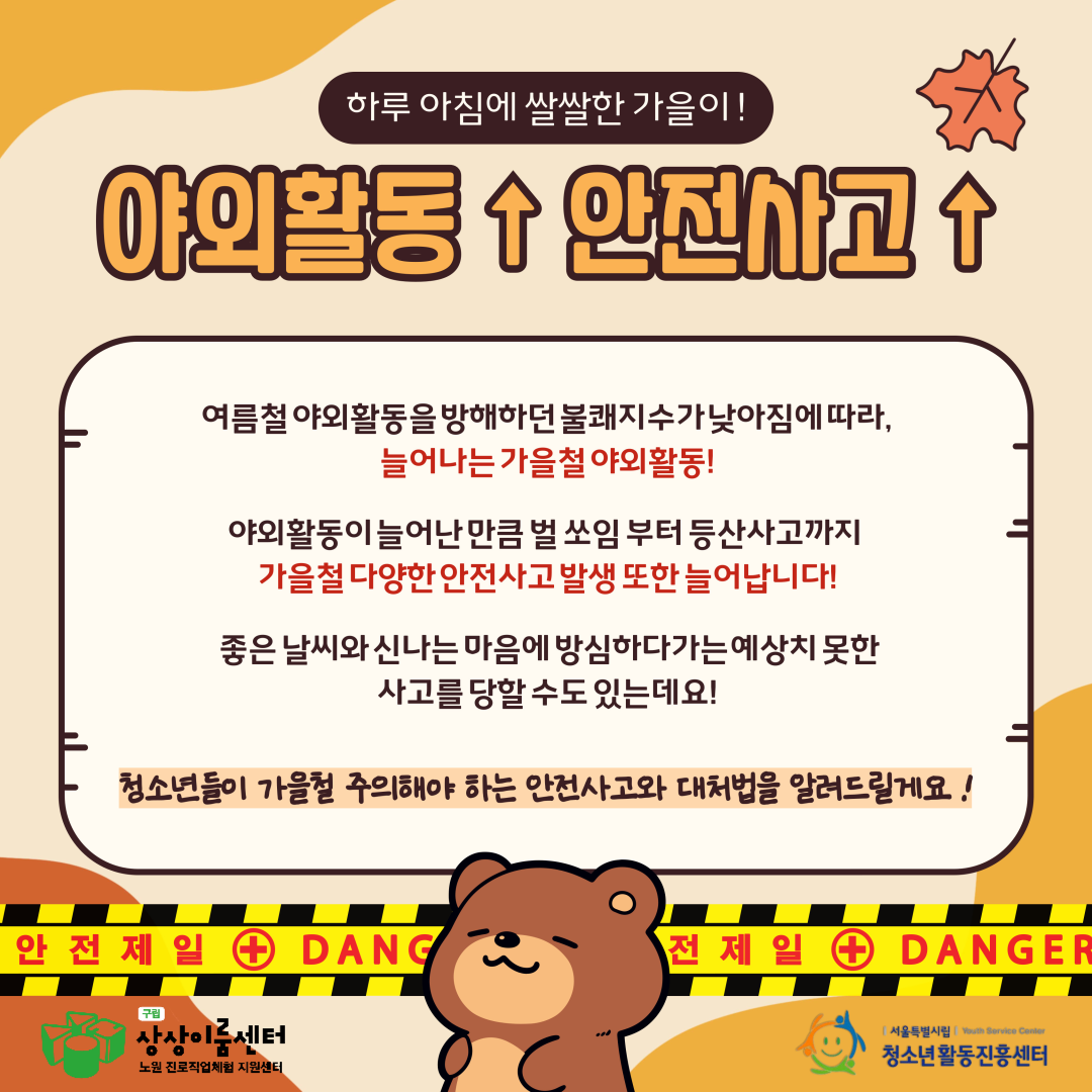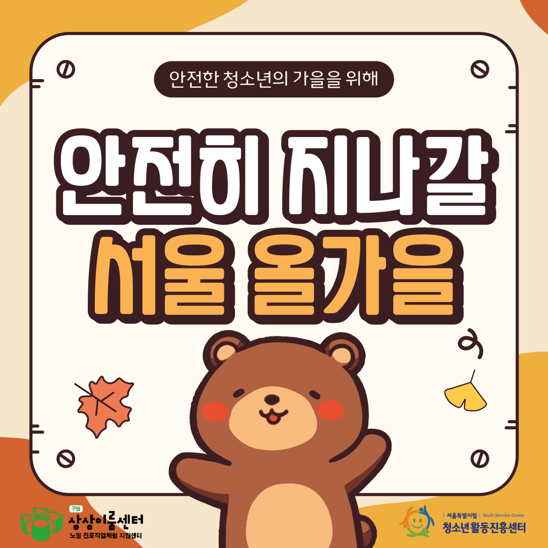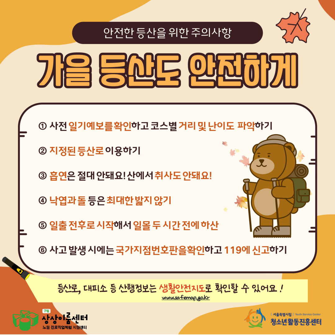 카테고리 없음 안전한 서울, 안전한 가을을 위한 안전하게 가을나기 by 상상이룸센터(노원진로직업체험지원센터) 2024. 10. 2. 공유하기 게시글 관리 상상이룸센터 - 노원진로직업체험지원센터