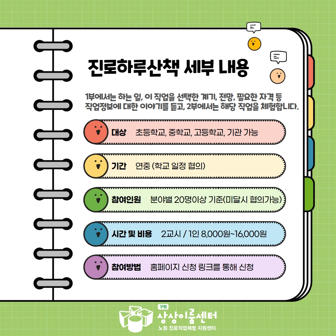 프로그램 신청서를 작성해주시면, 담당자가 확인 후 연락 드리고 확정합니다. 상상이룸센터(노원진로직업체험지원센터) 02-936-3326 진로하루산책, 직업인특강, 창업LAB, 창직공작소, 경제빌드업