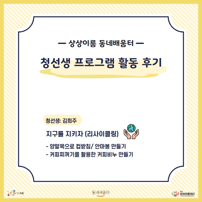 | 청선생 (김희주) 소감 - '환경'이라는 주제에 대해 같이 공감하고 이해해주어서 좋았고, 체험 과정도 잘 따라와주어서 좋은 경험이었습니다. 참여자 소감 - 양말목으로 컵받침 만드는 게 재미있었고 생각보다 쉽게 만들 수 있어서 좋았습니다. - 환경 수업을 듣고 환경에 대해 관심도 생기고 집에서 실천할 수 있는 방법들을 생각해보게 되었습니다. |