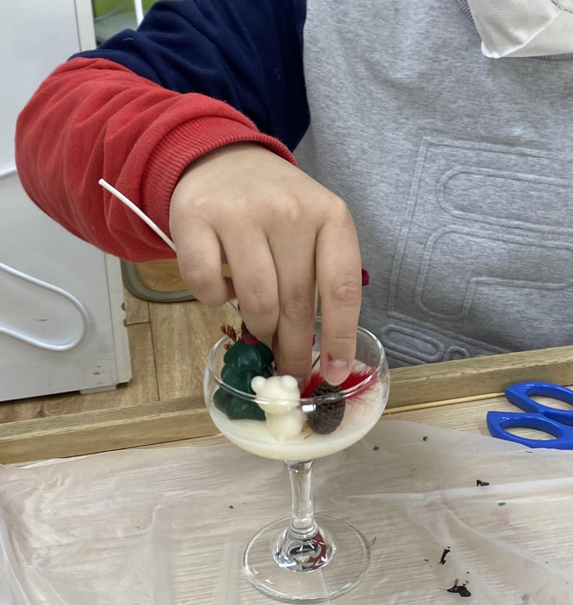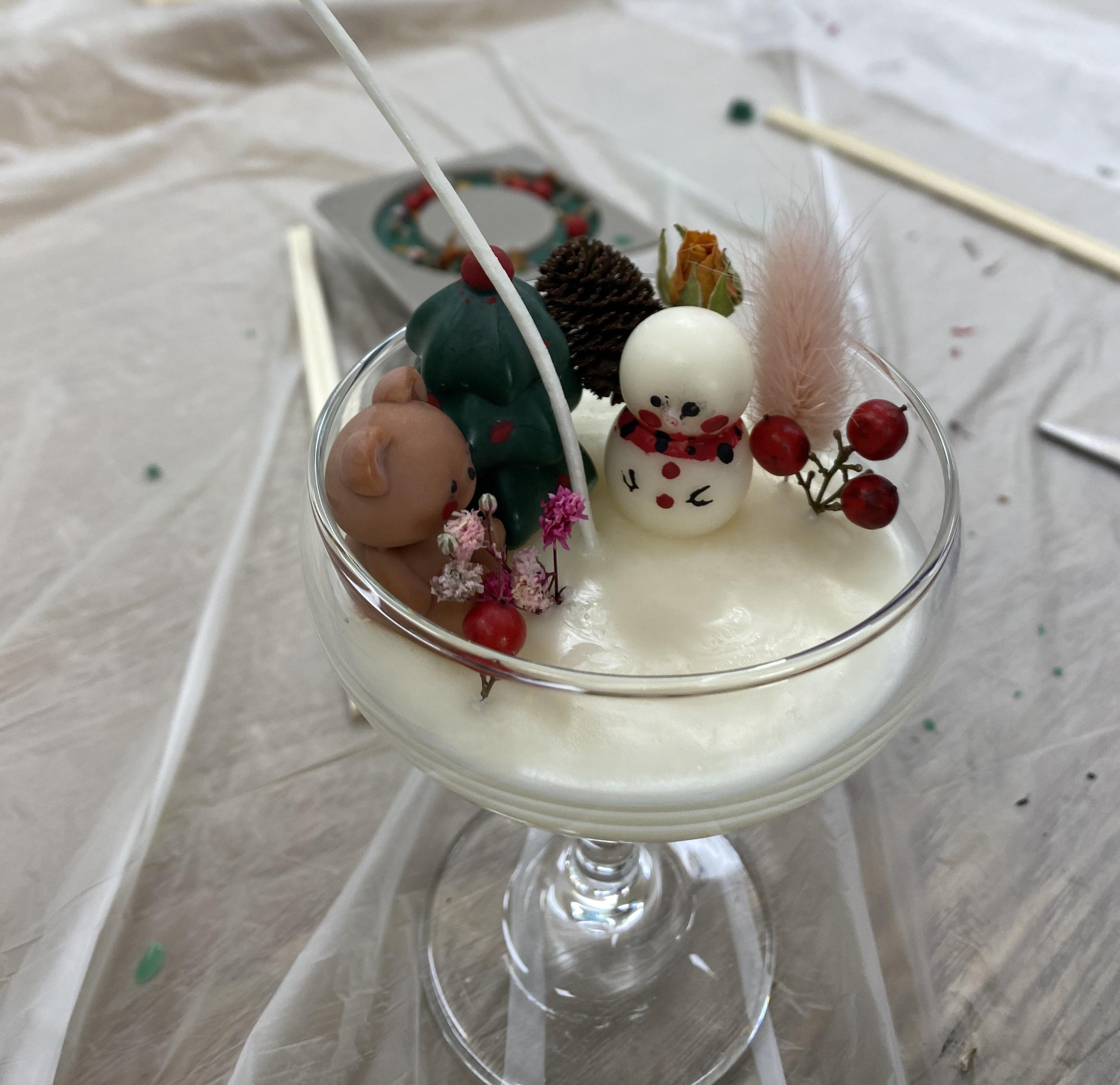 유리잔 안에 넣은 왁스가 굳어지면 꽃이나 눈사람, 곰돌이 등