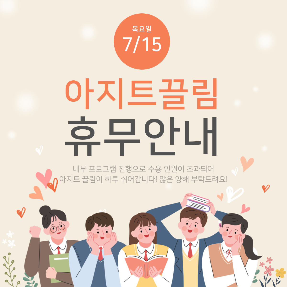 센터 내부 프로그램 진행으로 7월 15일 (목) 임시휴무를 안내 드립니다.