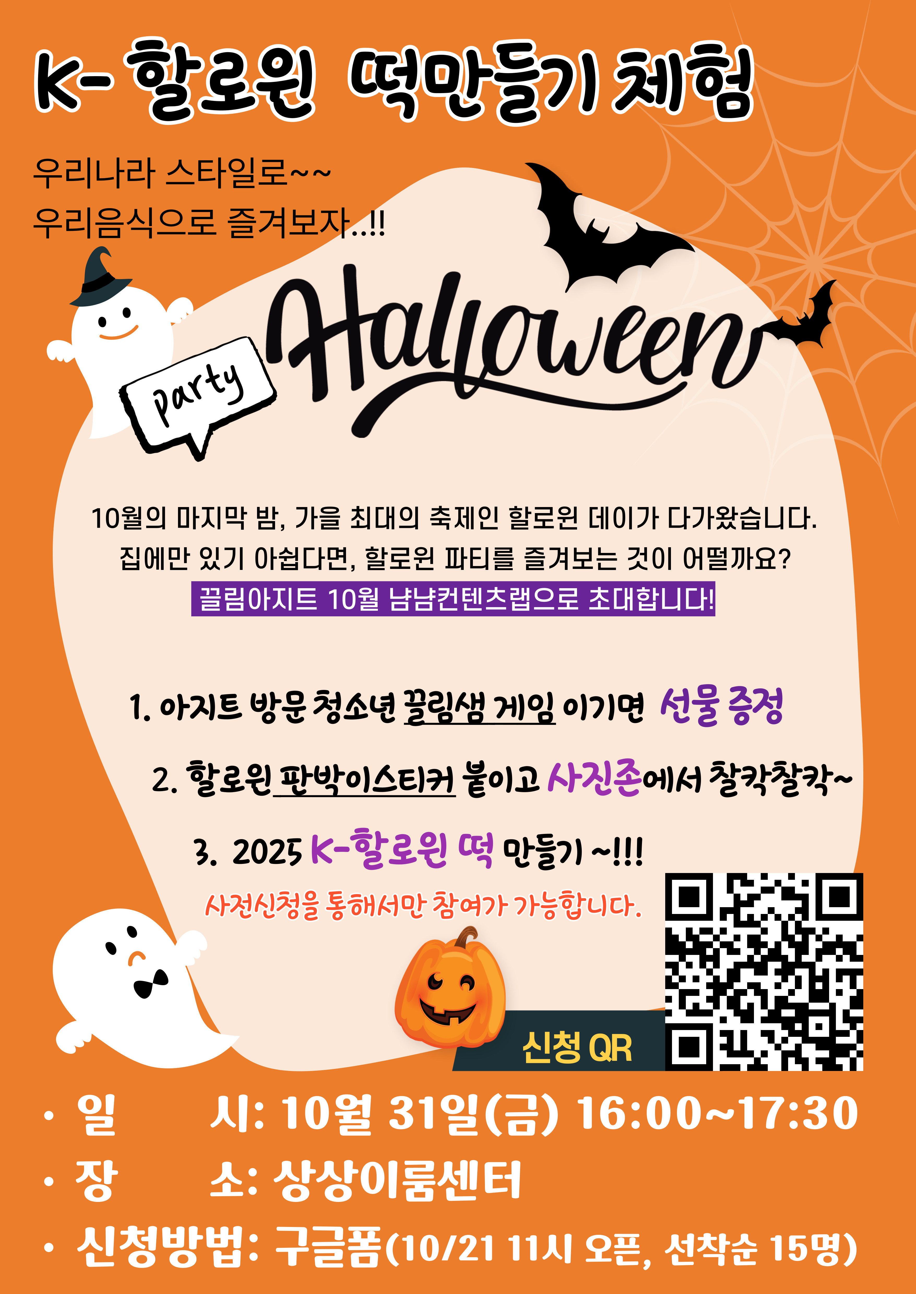 2025년 10월 끌림아지트에서 끌림 정아선생님과 함께 진행하는 '냠냠컨텐츠랩' 사전신청입니다. ■ 정아쌤과 함께하는 K-할로윈 떡 만들기 15:30 선착순 15명 ※신청이 완료되면 문자가 발송되오니,