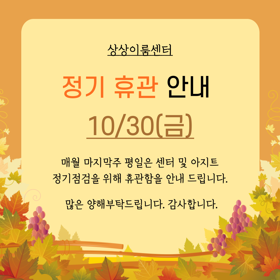 매월 마지막주 평일은 센터 및 아지트 정기점검을 위해 휴관함을 안내 드립니다.