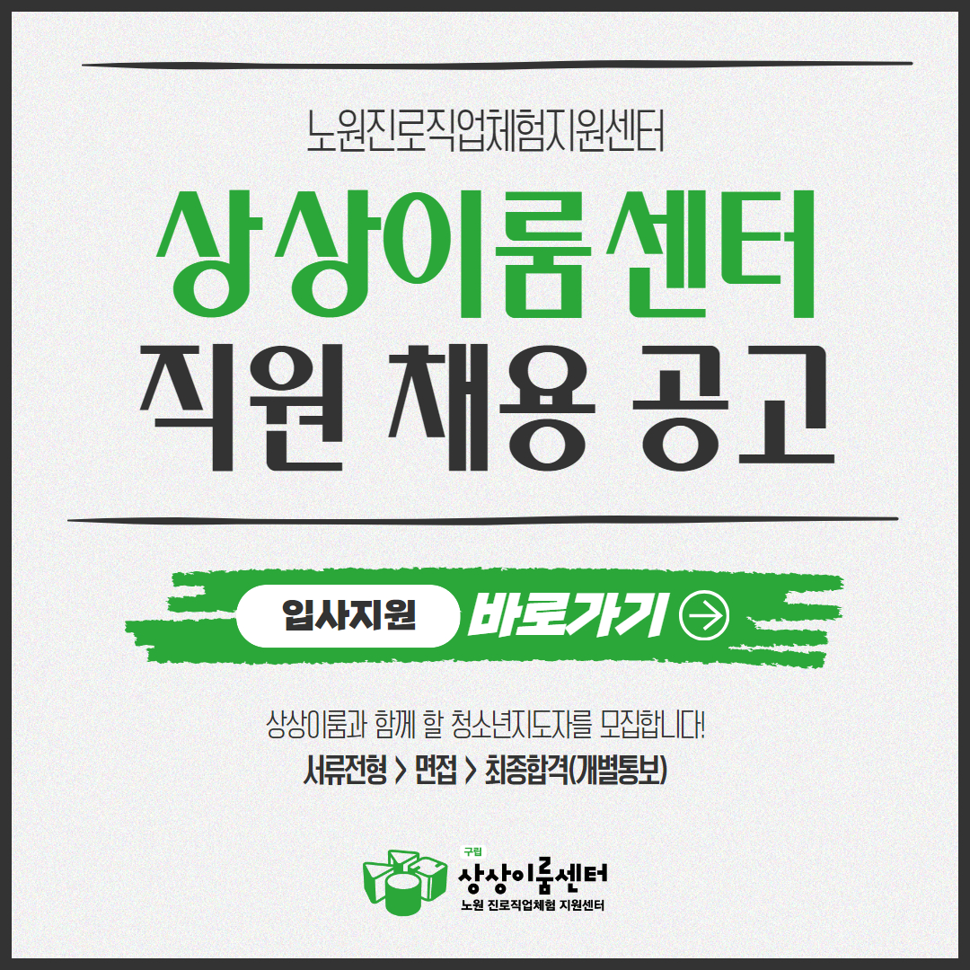 상상이룸센터(노원진로직업체험지원센터)는 노원지역의 청소년 진로교육 기반을 조성하여 노원구 아동청소년의 생애주기 및 발달단계별 맞춤형 진로지원 사업을 운영하고 있습니다. 이에 상상이룸센터는 직원 채용을 아래와 같이 공고하오니 청소년 진로교육에 관심있는 분들의 많은 관심과 지원 바랍니다.