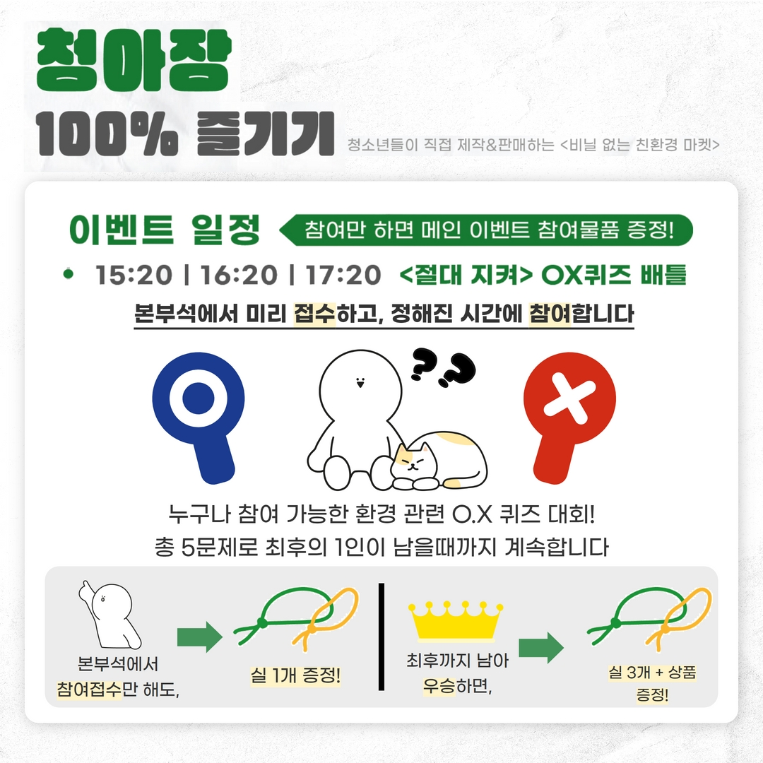 마지막으로 알려드릴 소식은 청아장 현장에서 <절대지켜> OX 퀴즈 배틀과 장난감 말 경마 대회가 진행된다는 것 입니다.