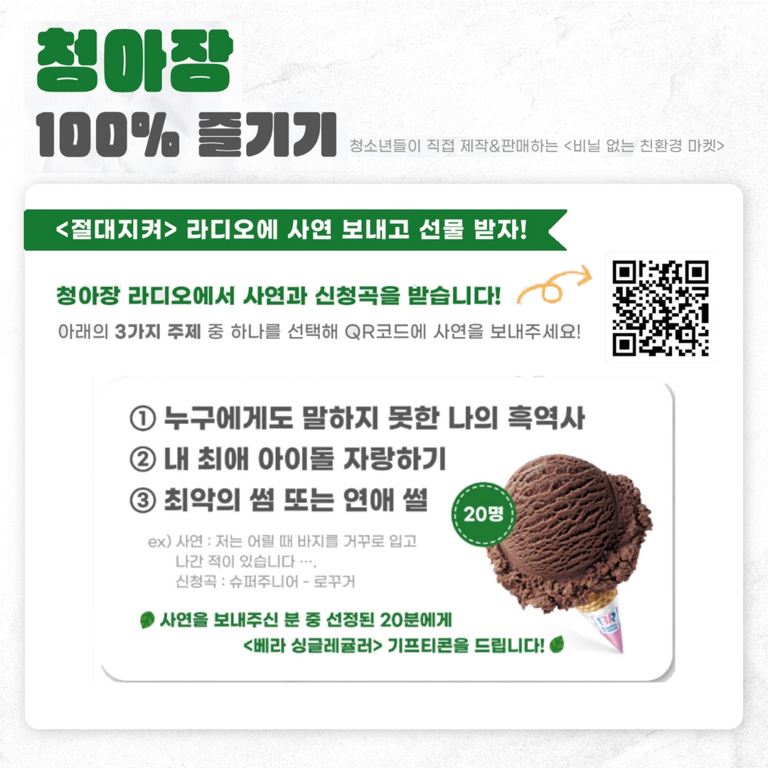 청아장의 청소년 기획단 청와아대에서 진행하는 라디오에서 <절대지켜>에 맞는 사연을 신청 받고 있습니다.