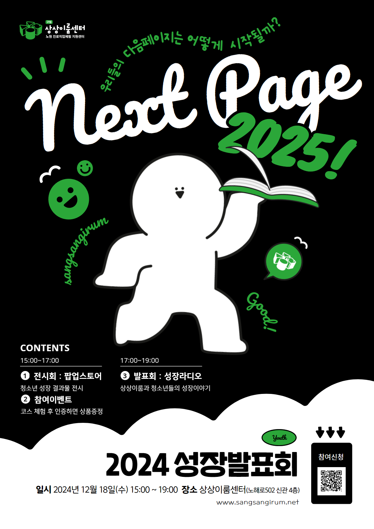당신을 2024년 성장발표회에 초대합니다! 참석을 희망하시는 분은 아래 입력 부탁드립니다 ^ ^ -일시: 2024년 12월 18일(수) 15:00 ~19:00 -장소: 상상이룸센터(노해로502 신관 4층) -내용: 성장 결과물 전