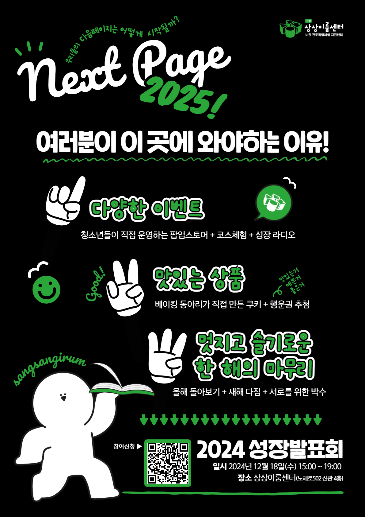 당신을 2024년 성장발표회에 초대합니다! 참석을 희망하시는 분은 아래 입력 부탁드립니다 ^ ^ -일시: 2024년 12월 18일(수) 15:00 ~19:00 -장소: 상상이룸센터(노해로502 신관 4층) -내용: 성장 결과물 전