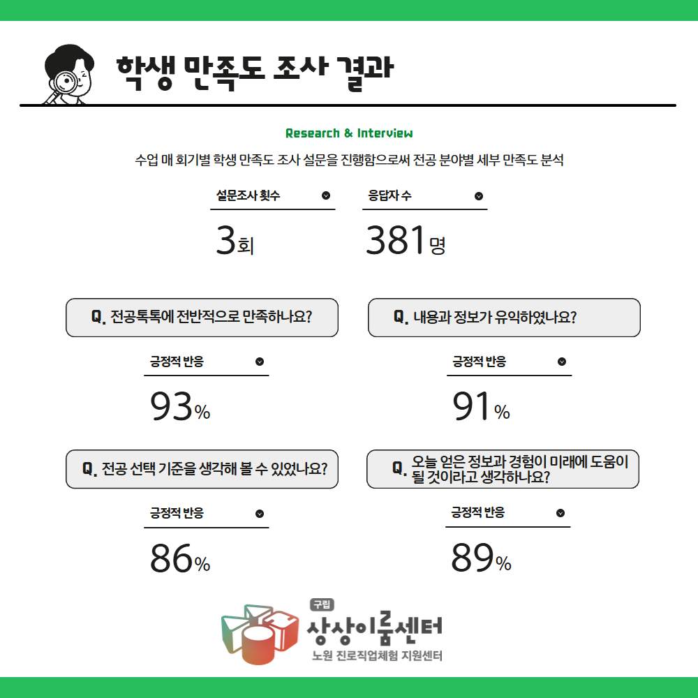 전공톡톡 프로그램에 전반적으로 만족하냐는 응답엔 93%가 긍정적인 답변을 해주었네요 :)