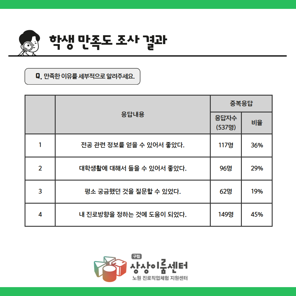만족한 이유에는 '진로방향에 도움이 되었다', '전공 관련 정보를 얻을 수 있어 좋았다' 는 답변이 많아