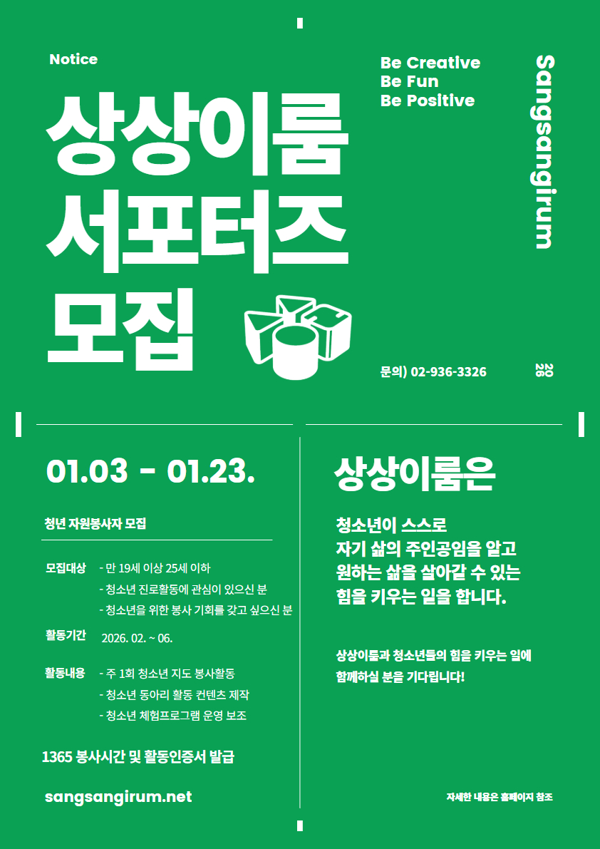 | 상상이룸센터(노원진로직업체험지원센터)직원 채용 재공고 (0) | 2026.01.26 |