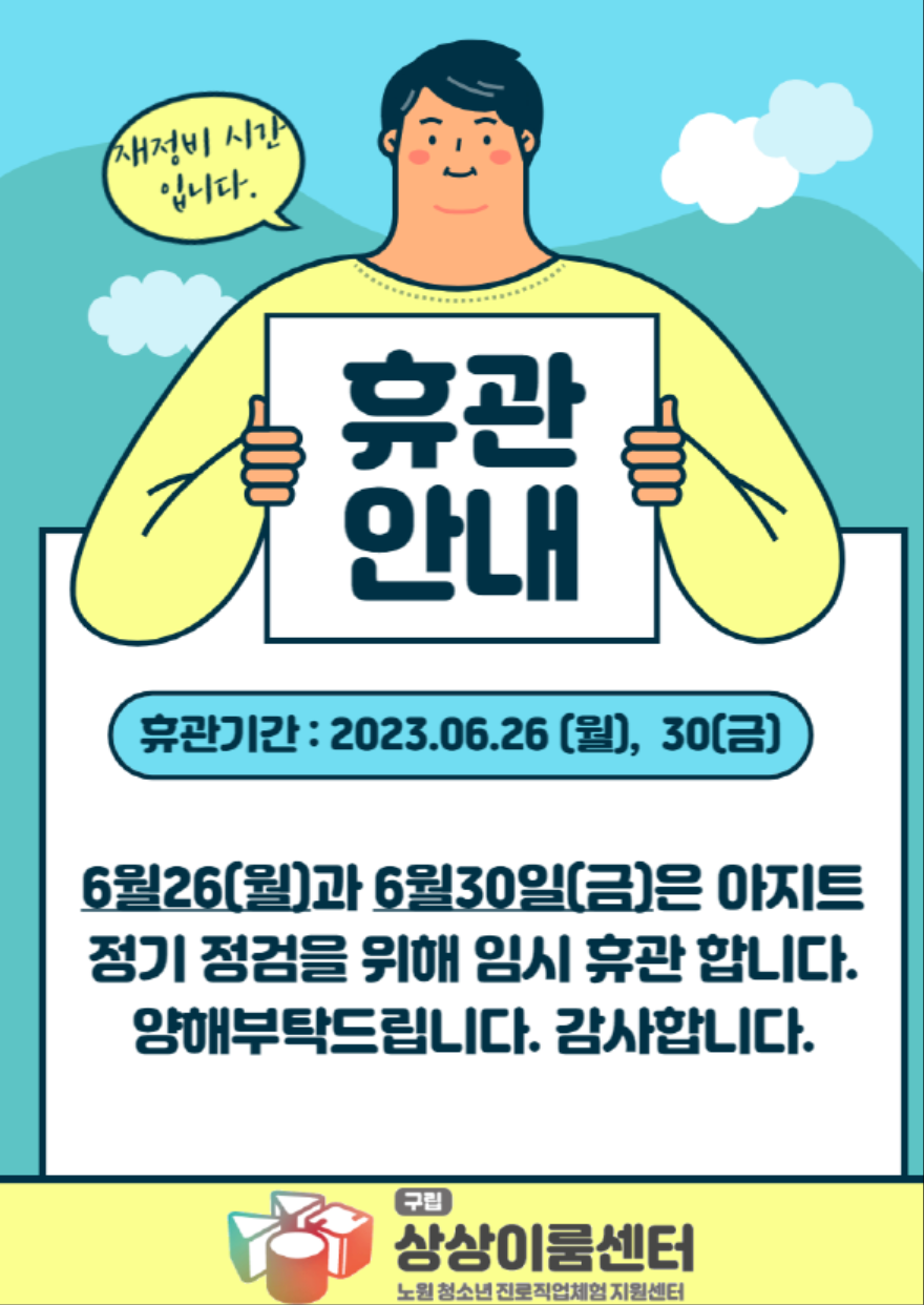 카테고리 없음 6월 휴관안내입니다! by 상상이룸센터(노원진로직업체험지원센터) 2023. 6. 14. [끌림 운영시간] ⊙ 월~금 13:00~19:00 ⊙ 토요일 10:00~17:00 ⊙ 공휴일, 일요일, 매월 마지막 금요일은 휴관 공유하기 게시글 관리 상상이룸센터 - 노원진로직업체험지원센터