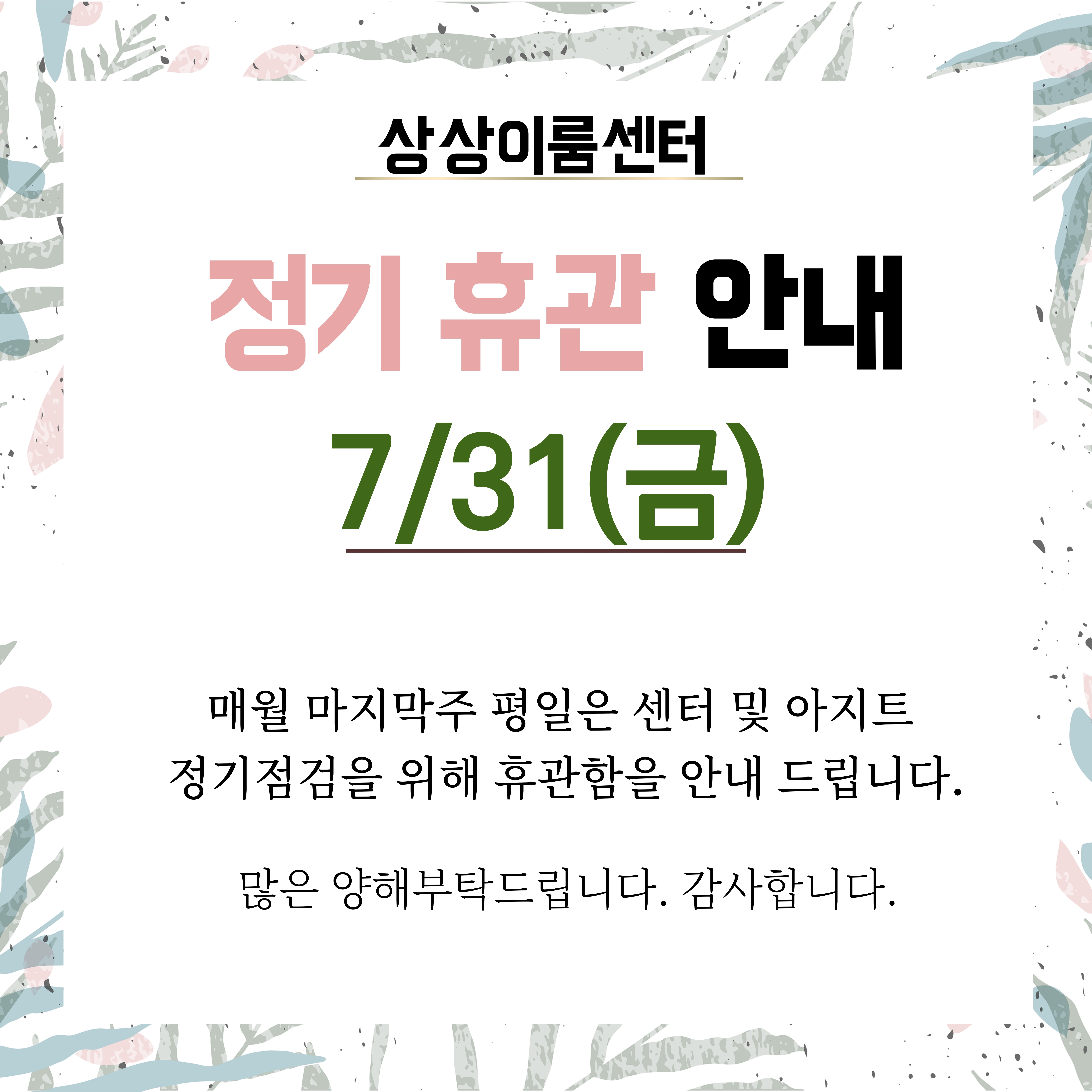 매월 마지막주 평일은 센터 및 아지트 정기점검을 위해 휴관함을 안내 드립니다.