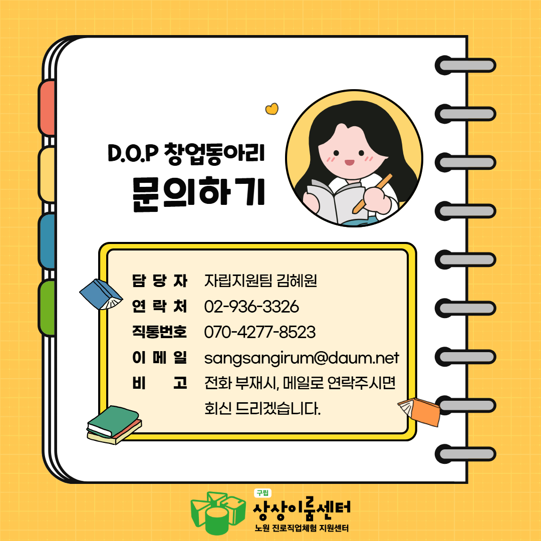 문의 : 상상이룸센터(노원진로직업체험지원센터) 자립지원팀 김혜원 070-4277-8523