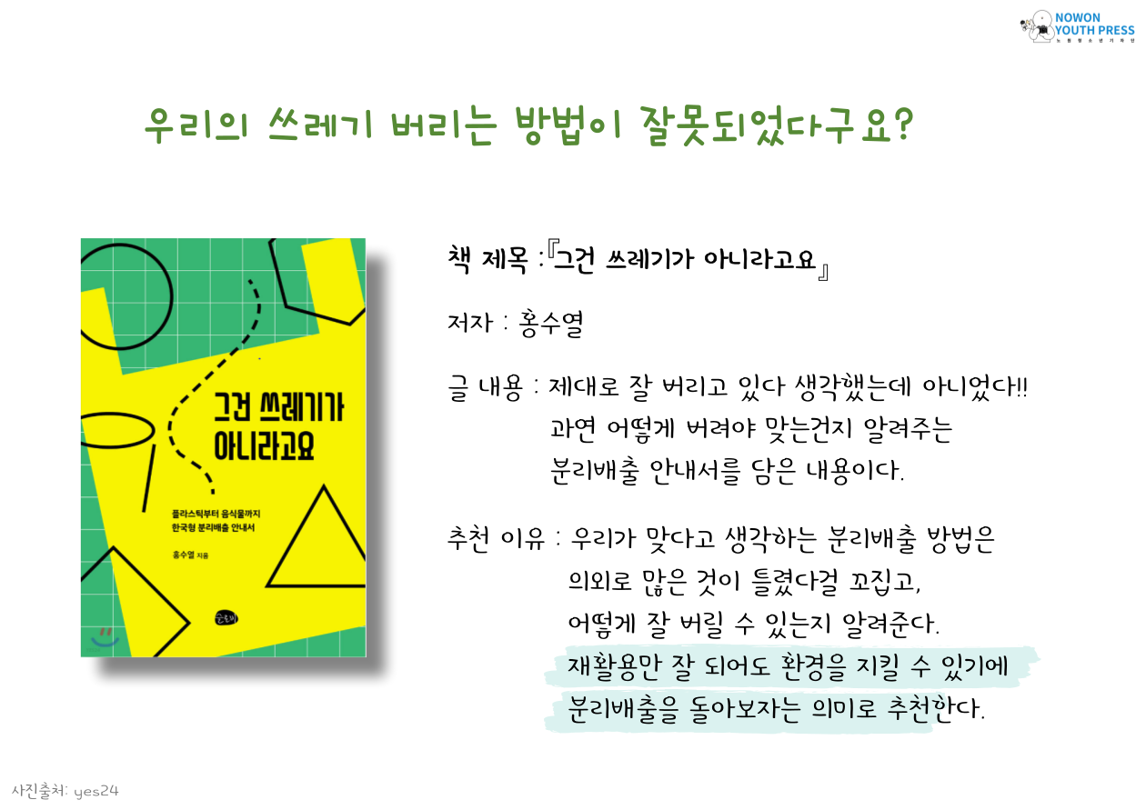 아래 책들을 읽어보시길 바라며 여러분들도 저처럼 환경을 위해 사소한 행동(물 아끼기, 안쓰는 전기코드 뽑기 등)을 함께