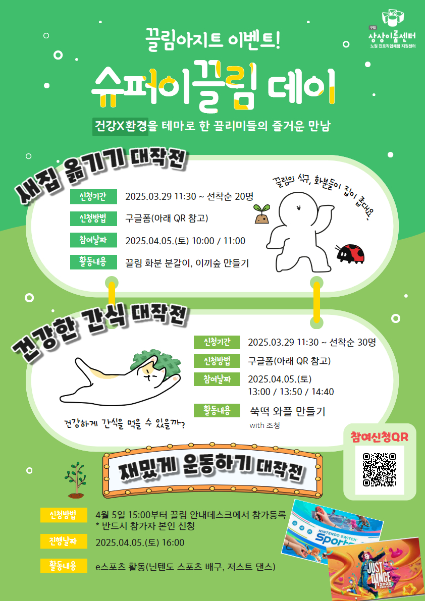 2025년 4월 5일 끌림아지트에서 진행하는 '슈퍼이끌림데이' 사전신청입니다. ■ 새집옮기기 대작전(분갈이, 이끼숲만들기 체험) 10:00 선착순 10명 11:00 선착순 10명 ■ 건강한간식 대작전(쑥떡와플